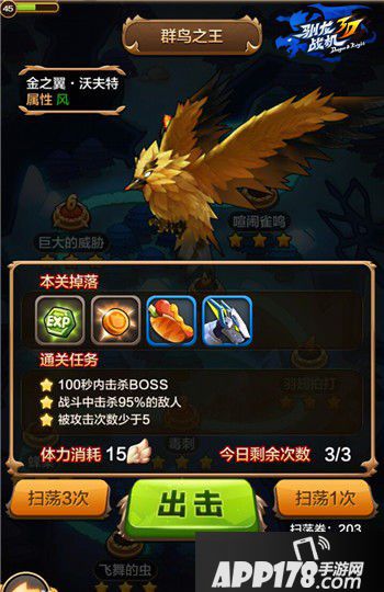 每一波的攻击前,BOSS都会有一到两秒钟的停顿,玩家细心观察便可对BOSS攻击的到来进行提前预测。在BOSS只剩下两个血条的时候,会掉落一个防御道具和一个攻击道具。玩家可以在第三波攻击时使用,这样就可以对准BOSS攻击,不必担心受到伤害。战斗力是取胜的重要条件,但是操纵飞龙的熟练度也是十分重要的一个条件哦。因此,在平时培养与飞龙之间的熟练度也是十分重要的!