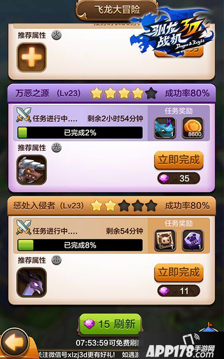 冒险任务是玩家们在战斗之余增强自身战力的又一方法。游戏中,玩家可通过完成相应的冒险任务获得游戏资源,包括金币、扫荡券、宠物抽奖券、装备材料等。冒险任务中有包括骑士团在内的各种委托,玩家根据委托需求派遣飞龙进行相应冒险,冒险成功即可获得相应的奖励。冒险任务界面里有不同等级、星级的任务,奖励也有所不同,点击分配好飞龙后就可以开始任务,等待相应时间后,就可获得相应奖励。此外,玩家可以同时做不同的冒险任务,最多可同时进行五项任务。通过冒险任务,玩家不仅可以获得资源来提升自己的战斗力,并且随着玩家等级的上升,冒险任务的奖励也会更加丰富,玩家可以根据自己的需求来选择任务,如果没有看到本身需要的任务,则可以选择刷新任务列表来获取新的任务。