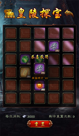 皇陵探宝作为游戏内奖励收集的玩法,通过消耗银两或元宝,可以进行探宝操作,从而获得大量奖励。探宝的每一层都隐藏着一个大奖,在探宝过程中位置靠近大奖会给予相应的提示。