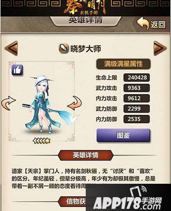 从晓梦大师的满星属性图中就可以看到,晓梦大师的生命已经破24W,伤害不管是武力还是内力,都是相当的高。