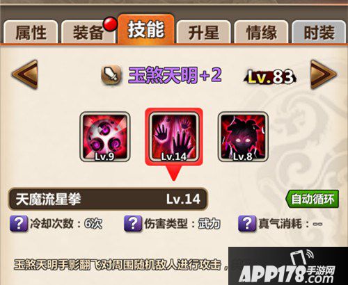 数据都在这,大家可以来算伤害,天魔流星拳的伤害=16980X306%=51958.8的伤害,因为是三段伤害再X3=155876.4的伤害,如果暴击下,据我看下来是翻倍的伤害=311752.8的伤害。