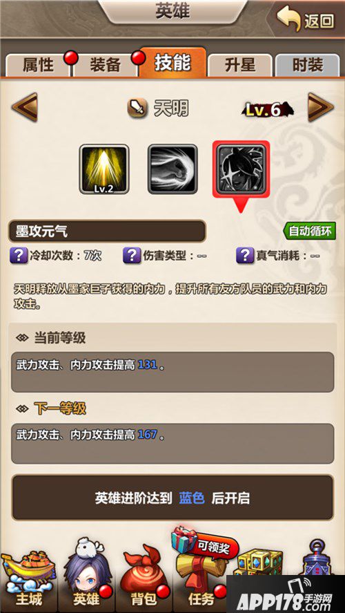 作为天明的第三技能,又是一个自动循环的技能,但是这个技能不再是攻击技能,而是利用墨家巨子的内力来提升友军的武力、内力攻击,这也尊定了天明在队伍中不可或缺的地步,尤其是在PVP中,一点点的提升都可以影响到战局在PVE中,只要提升一下,特别难过的关卡也会迎刃而解的。建议队伍中搭配武力、内力伤害加成特别高的额英雄,因为哪怕是该技能为一级,都相当于多带一件武器、典籍!伤害会加成特别多!