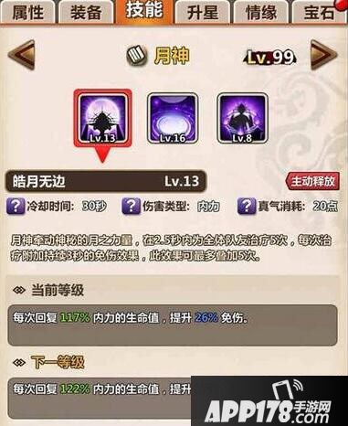 游戏中,月神被定位为后排辅助型英雄,她的主动技能拥有免疫伤害和为队友加血的技能。被动技能“水月幻境”可以在攻击敌方的同时恢复队友的生命,另一个被动技能“封眠咒印”可以使当前的敌方单位暂时封印所有技能且受到持续伤害。
