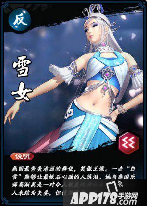 技能:凌波飞燕,雪女最知名的一支舞蹈,舞动时犹如雪燕纷飞于旋转间杀伤敌方全体单位(冷却13秒,真气消耗40。);白雪,雪女吹奏凄美的乐曲,白雪,召唤暴风雪,对小范围敌军在4.5秒内造成3波伤害,需持续施法。(冷却次数13次)