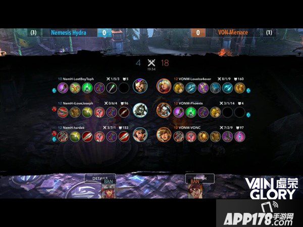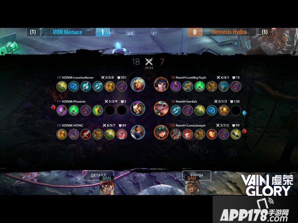 VON与Nemesis的第一局,Nemesis BAN了VONC赖以成名的机甲朱尔,而VON则BAN了Nemesis主力的猫女柯思卡以示还击。VON的出战阵容为魔女星乐斯,狂战士罗娜和魔狼福彻斯。而Nemesis则采用了醉枪手林戈、盲豹格雷以及护卫亚丹。