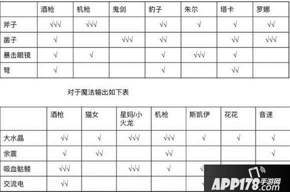 注:表中画“√”表示该物品在该英雄上装备可以获得较高的性价比,“√√”表示该物品经常出现,“√√√”表示该物品为核心装备。