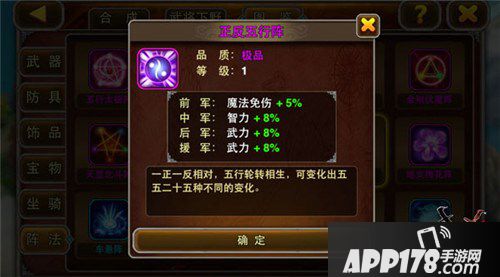 魔法流靠两仪微尘阵,弓箭流唯有正反五行阵不能辜负!正反五行阵能后排加武力,是为黄忠等后排物理输出量身定做的阵法,前排可以继续遣上物理攻击强大的赵云,也可以尝试物魔双修的杀伤性武将乐进、徐盛等!当然,在刷副本的过程中,大招技能也是有用武之地的,推图用四象八卦阵,效果显著!