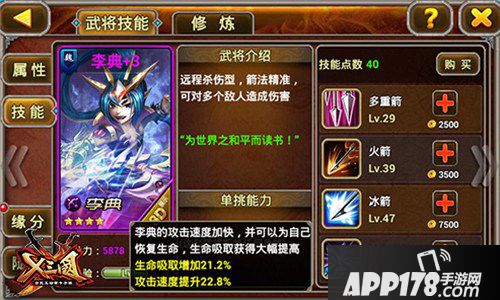 关于核心输出武将,在这里不得不提一下曼城,不是英超的曼城队!而是Wuli当红小生李典(字曼成),据说此将练就了一番惊人本领,有成为魔王克星的潜质。除了基础输出高以外,还有多属性箭矢,但最逆天的还要属被动神技“持久之战”,大幅提高攻击速度的同时,还有强力的吸血能力,这种不断攀升的输出与恢复能力如果再搭配一个强力奶,基本就是不死之身,被魔王喷几口立马就是满怒后的一轮技能大爆发,想想都恐怖!