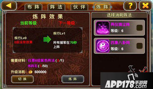 当紫色阵法达到6级以后,就会在阵法升级界面出现炼阵选项,首次进入要求选择炼阵种类,可以随意选择,后面可以切换。1级炼阵需要1个6级紫阵为消耗材料(就是说至少要有2个6级紫阵),其他等级自己升起来就知道了……,这样平民至少也要到中后期才可能用到炼阵,紫阵易得,阵法难升。