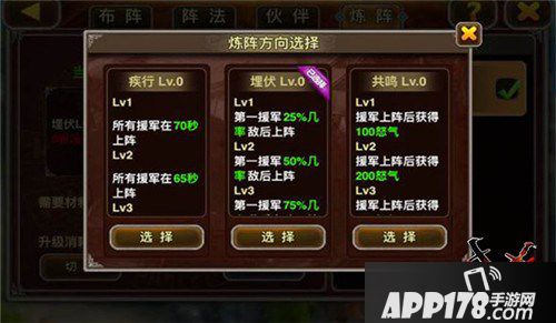 炼阵目前分为疾行、埋伏、共鸣三种,各有6级效果,等级越高,效果越明显。