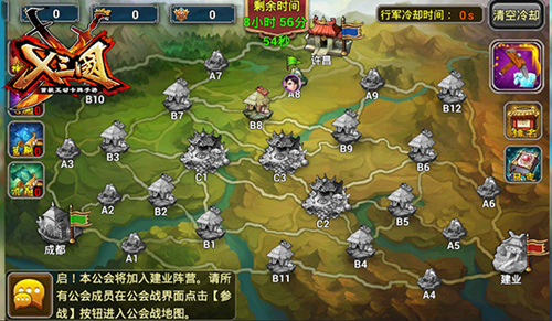 在《X三国》公会战中首次引入了阵营概念,让玩家更有三分天下的时代带入感。首次报名公会战会自动分配到一个阵营,阵营内的公会属于同盟状态,不可攻击,不同的阵营势力占领据点也以不同的颜色的旗帜来表示。从下一次开始,公会战第一名的公会会固定分配在许昌阵营,并且不能更换阵营,而其他公会则会随机分配到剩余的两个阵营进行对抗。