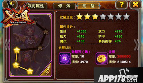 酷炫霸气的外形是觉醒带给武将的最大改变,各位玩家最关心的还是觉醒能给武将带来什么样的提升。觉醒分为7个阶段,每个阶段需要消耗的一定的材料,完成一个阶段,该武将则可获得一定的属性加成。完成全部阶段,武将觉醒,外形升级改版,觉醒技能解锁。