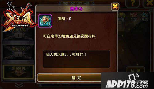 欣赏完觉醒武将的英姿后,肯定想立马将自己的武将进行觉醒修炼呢,奈何又不清楚觉醒的道具哪里获取?在本次新版本上线后,游戏在增加一个全新的玩法,名为南华幻境。在幻境中,挑战一次关卡都可以获得南华令,而南华令可在南华幻境商店中兑换觉醒材料。