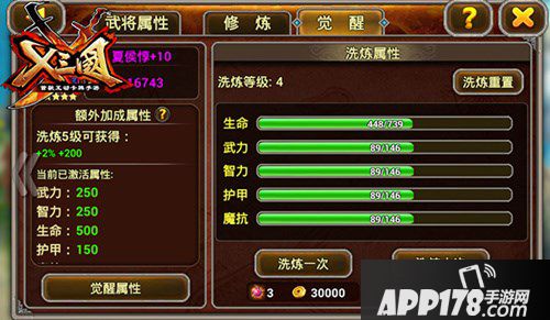 已觉醒的武将可以花费仙灵石和金币洗炼武将的主属性,主属性分别是生命、武力、智力、护甲和魔抗。当五条洗炼属性达到当前等级的最大值时,可以消耗仙灵石和金币提升洗炼等级。每个武将的洗炼等级各自独立,同时武将洗炼达到一定等级即可激活额外附加属性。