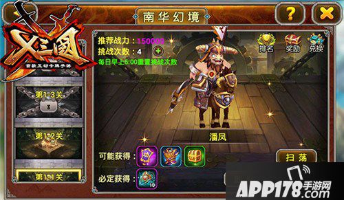 南华幻境有风险,进入需谨慎。南华幻境是目前难度系数最大的挑战,对前来闯关者有一定的实力要求,战斗力过低只会狗带!把守关卡的武将实力不容小觑,就好比第一关的貂蝉,又是离间又是弹射的,如果后排武将太脆弱,很容易就丧失火力输出,通关成为空谈。