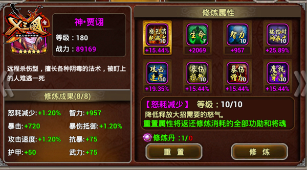 智力武将大多会选择生命、智力、攻速、减怒、魔穿、减控、暴伤、暴抵的路线,贾诩虽不例外,但也有些不同。在实战中,因为贾诩手短的缘故,大招释放往往只会恐惧到1-2名敌人,大招的效果并不完美。主要依靠小技能的输出,而小技能非常需要暴击的加成。因此可以放弃减怒,选择修炼暴击。