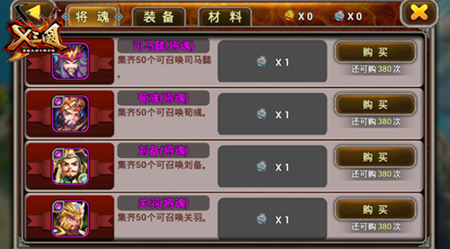 比武大会是《X三国》玩家获取将魂的一种途径,至尊商店中出售的将魂多达14种,还囊括司马懿、孙策等稀有将魂。比武大会结束后,玩家使用银勋章进行兑换,一枚银勋章兑换一个武将将魂,最多可兑换380次!