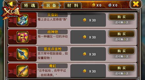 想靠碎片合成橙装,不仅需要大量的时间,还要有非常好的人品,才能每次刷本都能获得碎片。在至尊商店中,你可以直接购买,虽然需要的金色勋章不少,但橙装带给武将的实力提升可是非常非常可观的!