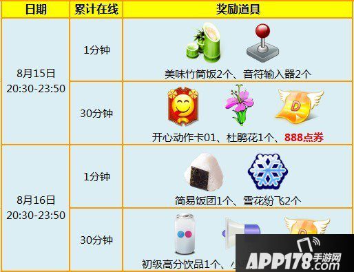 8月15日-8月16日,20:30-23:50 累积在线1分钟和30分钟即可领取7776点券+珍品道具。