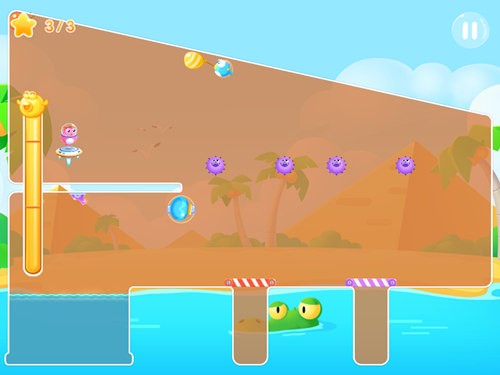 随着气球的上升可以收集到后面的星星,接下来会漂移到第二颗星星的上方,此时也要眼疾手快,点破气球,刚好不偏不倚地下落并收集到中间的星星。这一步骤可能需要多次的练习才能拿捏好下落的位置。最后回到水池后,再打开最后的红色机关门,跟随黄色的泡泡气球上升即可。