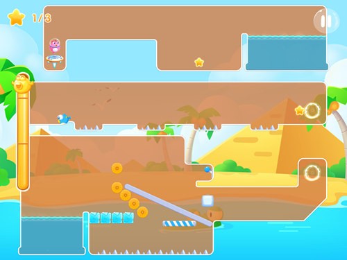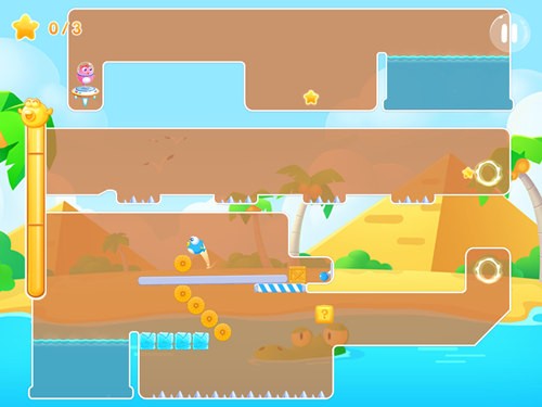到第二层时,由于不能将小鱼抛起,所以只能靠冲刺和反弹,一种方式是轻轻地加速,小鱼则会在三个反弹平台上行走,刚刚好都不会碰到冰刺。还有一种就是直接大力加速,靠运气,直接弹射到上方再反弹下来进入到传送点。而第三层就直接借用抛射反弹的方式就可以直接将最后一颗星星收集,并到达终点。