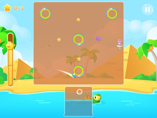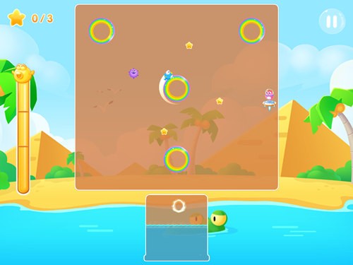 本关的难点在于上图的4个彩虹圈圈和围绕中间一直旋转的三颗星星和海胆怪。而且本关并没有任何其他能量补给点,这就意味着小鱼进入该地图后就需要在有限的能量条下收集三颗星星并最终到达终点处。如果落地就需要花费大量的能量将小鱼救起。其实本关要过关还是很容易的,一开始直接冲向粉红小鱼处即可,但没三星就没挑战,相信如果没有三星过关很多玩家也都会不甘心的。