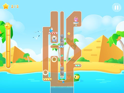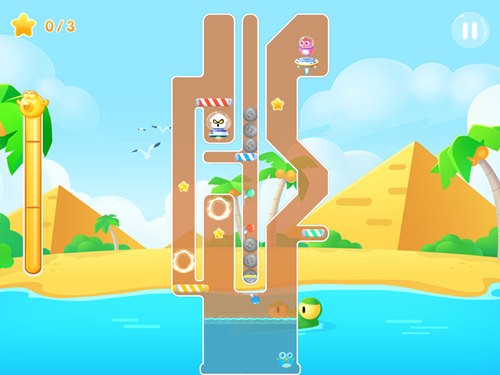 所以正确的解法是如何去控制这六颗铅球的下落,首先先控制小鱼打开蓝色机关门,当第一颗铅球降落时,马上再次跳跃关闭机关门。此时,红色门会打开,粉色门会挡住前往终点的道路。而由于铅球一直压着黄色按钮,所以黄色机关门就会一直打开着,这时还不能进去收集星星,因为红色机关门已经打开,必须要再次关闭才能通过。接下来再次打开蓝色机关门,让另外一颗铅球降落,此时又会触碰到两个机关,红色机关门就会关闭,粉色机关门就会打开。接下来只要操控小鱼进入穿越洞口获得小鱼即可,最后小鱼回到水池中,沿着右边的通道就可以直接到达终点。