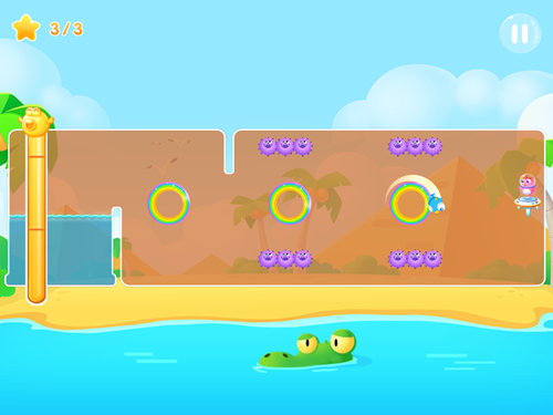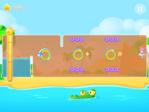 本关的地形比较简单,三个彩虹圈圈并排在一起,三颗星星也围绕着彩虹圈而转动,如果只是这样的布局那么要通过彩虹圈圈到达终点还是很容易的。但本关的难点就在于路程中的海胆怪,在第二、三个彩虹圈圈处都有多只海胆怪把守,每隔一段时间就会压向彩虹圈圈,这也就意味着小鱼必须在这段时间逃出,否则就会被海胆怪抓住。需要注意的是两排的海胆怪巡逻时间也不同,这是一个有效的突破口。