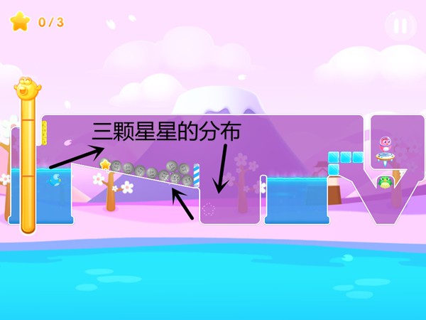 接下来就是下半部分,也是本关会致命的阻碍——河豚。首先我们需要操作小鱼击破入口的冰块,轻轻碰触即可,用力会导致反弹。在看准时机等河豚要向上巡逻时操作小鱼进入,并适时地进行加速冲刺,以便让小鱼能够冲向目的地。