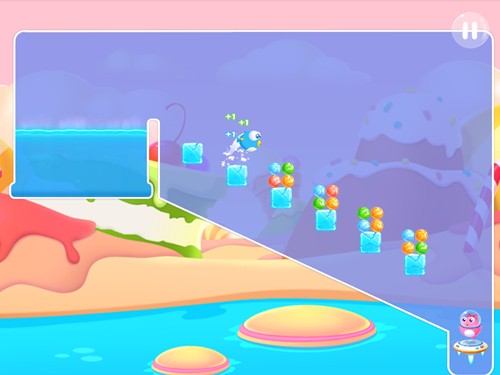 《小鱼飞飞》的糖果屋第二关看似简单,只是由六个冰块组成台阶,每个台阶都有4颗糖果。但仔细观察可以看出前面两块冰块是完整的,而接下来的冰块都处于脆裂状态,要通过冰块的反弹难度就越大。小鱼从上向下跳入即会达到目标点,该关卡也没有加速能量可供使用,想通过冲刺反弹的策略也较难实现。另外,本关总共有24颗糖果需要收集,但只需20颗糖果即可算过关。