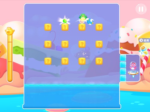 从布局上看,本关并没有什么太多复杂的陷阱,在地图正中央规律分布了12个问号型方块。周边有只河豚在四周巡逻,终点处有四块冰块挡住,但这些冰块并不能算障碍,要突破过去还是相当容易的。