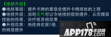 会在第九章宝象国--皇者叹关卡后开放,绝技会提升卡牌技能的伤害,也是消耗元气的,但是感觉消耗的有点多,建议先把元气用来卡牌升级,富裕剩下的可以考虑升级绝技。绝技高,技能伤害的提升也是很显著的。