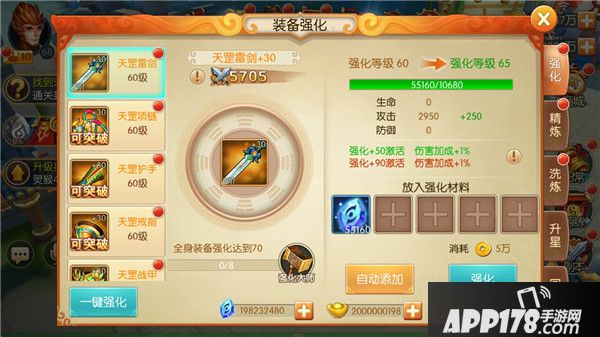 装备强化:装备具有攻击,防御,生命这3类属性,通过装备强化可以提升这些属性。装备强化是通过放入强化材料和消耗铜币来强化装备,强化材料可以是低级装备(绿色和蓝色),也可以是装备强化石,以及铜币。装备强化等级上限为玩家当前等级的两倍,装备强化到一定等级需要突破,突破需要消耗万能突破丹。装备强化到一定等级可以获得额外的属性。