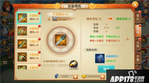 装备精炼:装备精炼可提升装备自身属性,装备精炼需要消耗装备精炼石,精炼到一定等级需要消耗装备自身,8件装备同时精炼到5的倍数可获得额外属性加成。