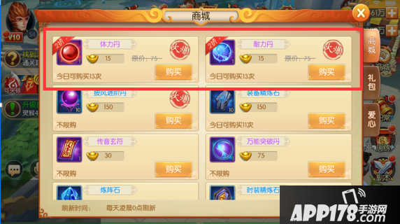 体力丹,耐力丹:尽量每天都买满,稳赚不亏,错过没地方弥补,经验是头等大事。