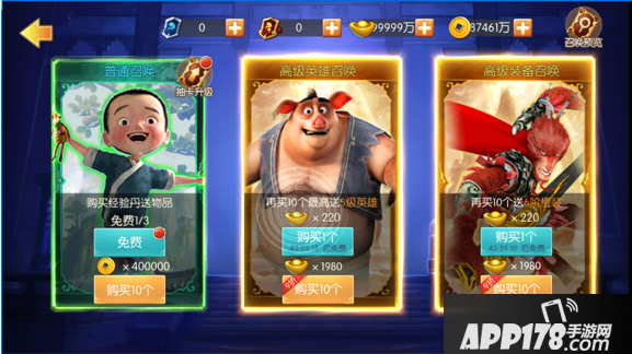 召唤:高级英雄召唤和高级装备召唤可谓良心。高级英雄召唤首次付费召唤获得巨灵神,10连高几率S英雄,甚至可能出2-3个,前期提升巨大。高级装备召唤首次付费获取6阶头盔一个,10连保底一个6阶橙装,有较高几率出多个,但是推荐10连一次性价比最好,多次10连容易同位置装备溢出。