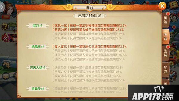 3. 根据上述的选好英雄后,就是搭配副将了。这点,大家根据英雄系统中的“阵容”下的羁绊提示,进行搭配即可。