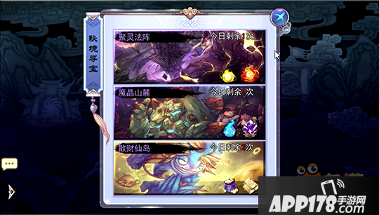 秘境寻宝氛围3个副本,分别是聚灵法阵、魔晶山麓和散财仙岛。每个副本都会产出不一样的资源,也会有十分有趣的小玩法。