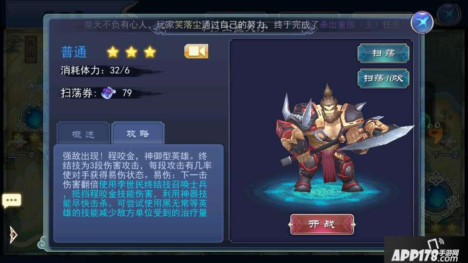 等到第三波见面时李世民变身,抗几下,等神器技能出手(能放就放),然后连点陈靖仇的技能(灵力满就放),同时把天兵招出来(因为天兵可以存在一定时间)只要意识不差,随时可以挡程咬金的技能,刀斧手可以忽略不计(这货感觉是来客串的,没啥存在感),等鲛鱼和弓箭手的群攻过后,小雪立马把血拉回来!李世民的变身结束之后,如果血线较低就继续变身!(保证三星通关),如果血线可以就无限招天兵挡前排,黑无常自由攻击,有技能就放!保证快速的出神器技能,直至结束!