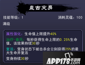 最大限度的提升自身生命上限。点出提升双抗和物理、法术攻击的天赋,提升血的质量。点出天赋强-归元,则能根据自身生命上限来回复生命值。与此同时,九元苏生中的治疗效果也是根据生命上限获得生命值的。在变身状态下被击杀还能复活。血多、肉厚、能恢复、能复活,盘古可以充分的吸引火力,为后排输出提供良好的环境。