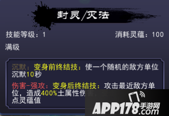 封灵/灭法:攻击最近敌方单位,造成高额土属性伤害,受击单位失去部分灵蕴值