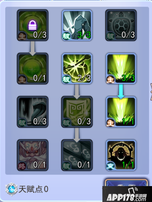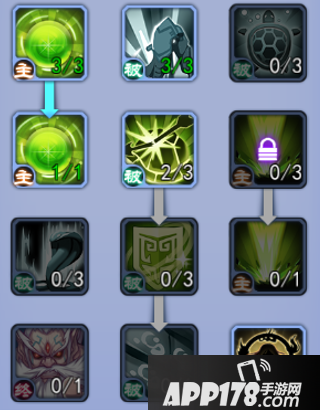 如图,最大限度的增强自身的攻击力和伤害天赋。强-石破/惊天,对敌方单位造成伤害的同时自身获得一个可以抵挡敌方5次伤害的护盾,对自身进行保护。学习九元苏生天赋可使自身的生存能力得到加强,同时变身后自身的终结技为输出类型,可配合己方其他输出类英雄进行输出。