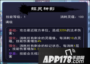 如 上图,通过点满浩气四塞,点出强·浩气四塞这一天赋,为自身提供6层标记状态,每层标记可以提升1%自身法术攻击,且提升25%的自身穿透。这样会在接下 来的一段时间自身的法术伤害得到加强。通过点满厌火咒可以在每次普通攻击时,再为自身提供3层标记状态,冯虚御风能增加单位时间内的攻击速度,变向的对叠 标记状态层数进行了强化最。点出强-蝶灵神影天赋,对自身终结技的伤害进行强化。当标记效果配合自身灵蕴值达到一定的数量时,释放自身终结技可对敌方神御 型英雄造成巨量的伤害