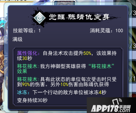 变身技能效果:变身的同时敌方下一个行动的敌方单位被冰冻。自身法术伤害在变身期间大幅度提升,同时在变身期间会替我方神御型英雄承受部分伤害,变身效果持续30秒