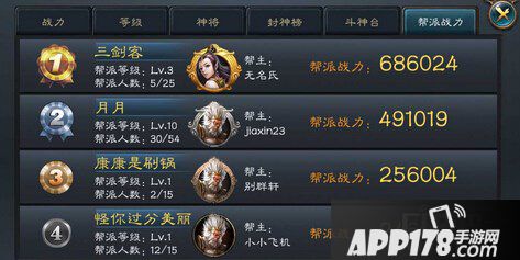 排行榜分为战力、等级、神将、封神榜、斗神台、帮派战力。