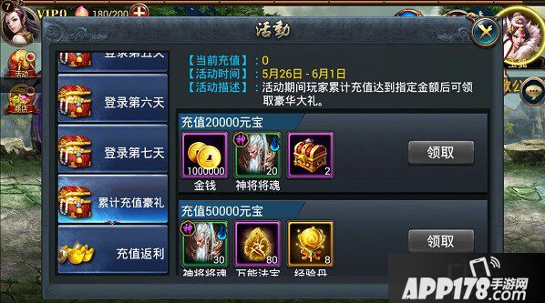 累冲20000元宝:魔太上老君将魂*20,五级生命灵石箱*2,金币*1000000