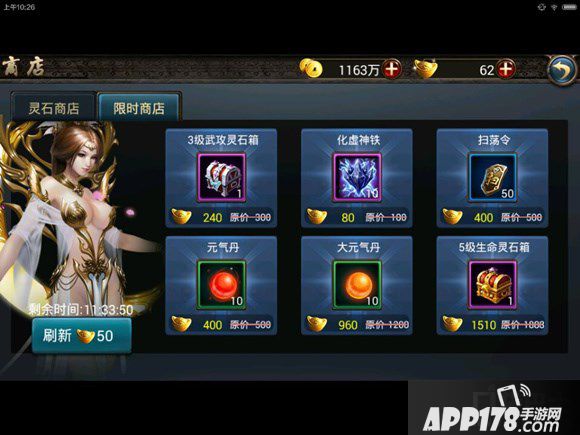 限时商店卖的是一些稀有物品,元气丹、化虚神铁等等,只有一页,可以用50元宝刷新,物品也是通过元宝购买,土豪可以在此壕购一番。这也是与平民拉开战力的一个简单途径。