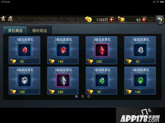 西游降魔篇手游商店分为灵石商店和限时商店,灵石商店售卖的是各种灵石,包括生命灵石、武攻灵石、武防灵石等等,分为3页,通过元宝购买。