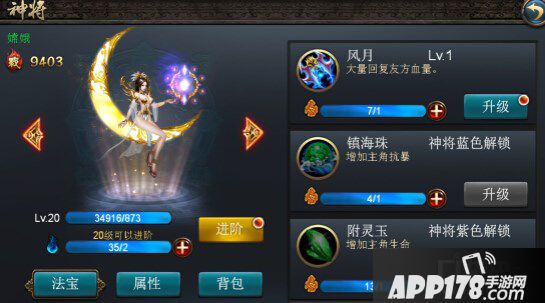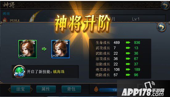 获得足够将魂就可以进阶啦。进阶会增加神将的品质并且激活被动法宝技能,大幅度的提升神将属性。
