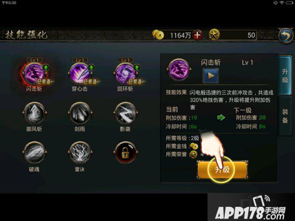角色等级达到18级时开启技能强化系统,选择技能点击升级,可以升级相应的技能,技能右上角的小绿原点表示此技能可以升级。